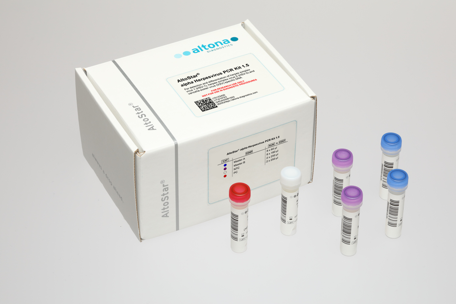 The AltoStar® alpha Herpes PCR Kit 1.5 is a reagent system, based on real-time PCR technology, for the qualitative detection and differentiation of herpes simplex virus 1 (HSV-1), herpes simplex virus 2 (HSV-2) and varicella-zoster virus (VZV) specific DNA.